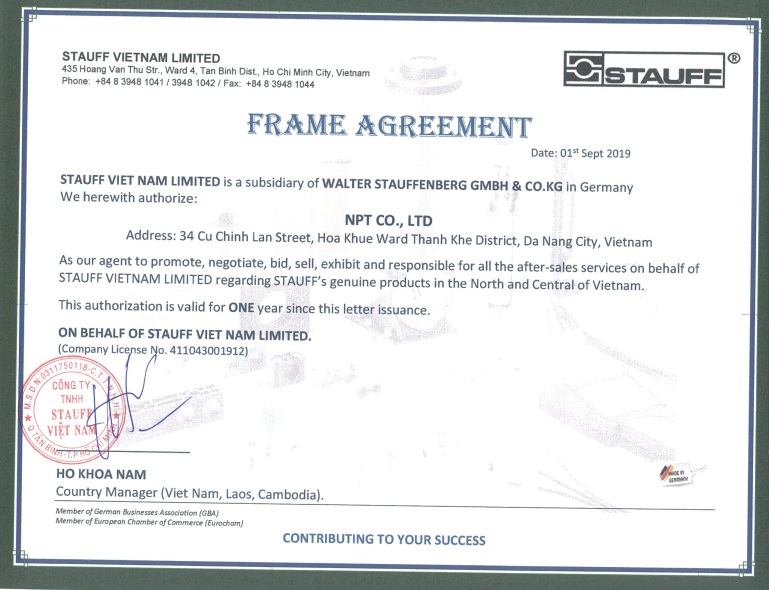NPT TỰ HÀO GIỚI THIỆU QUÝ KHÁCH HÀNG CHỨNG NHẬN ĐẠI LÝ STAUFF - ĐỨC | ![]() |