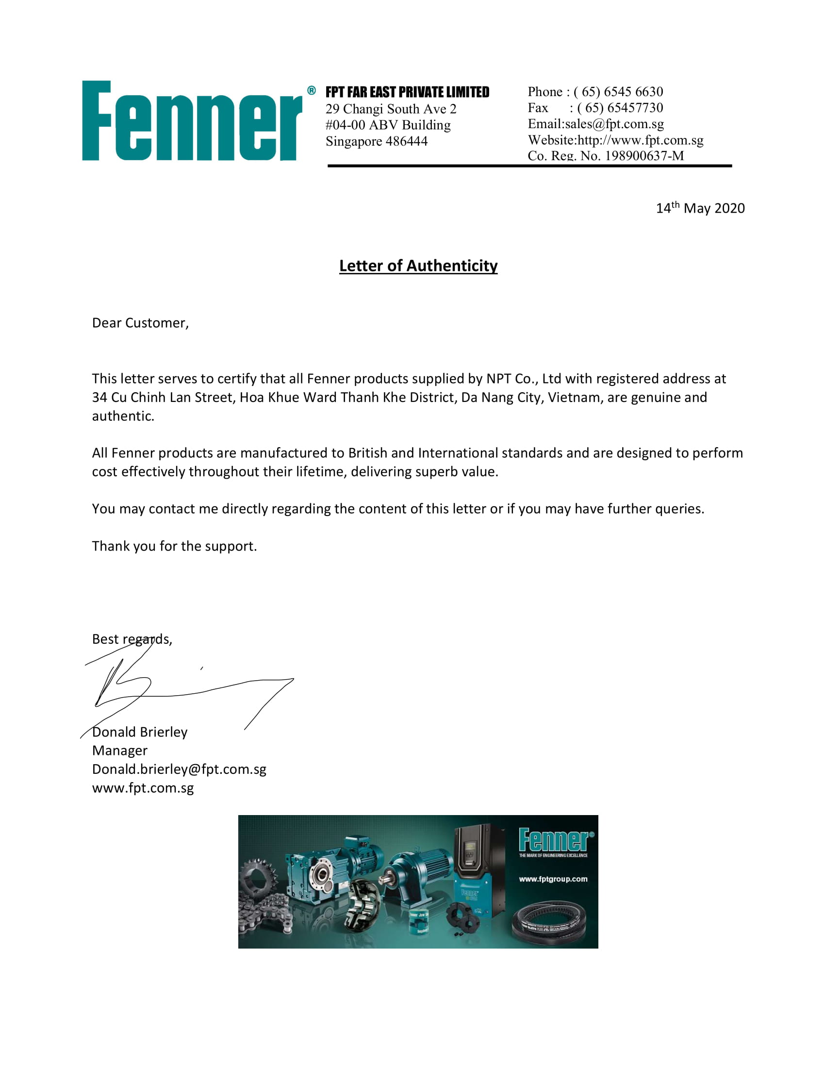 NPT TỰ HÀO GIỚI THIỆU QUÝ KHÁCH HÀNG CHỨNG NHẬN NPP FENNER - ANH QUỐC | ![]() |